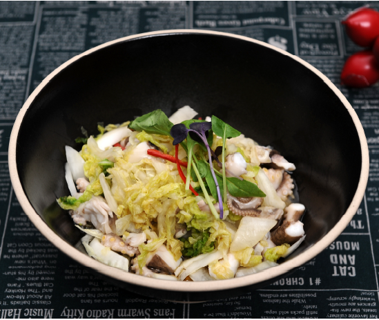 백김치(100g), 주꾸미(100g), 파(10g), 양상추(10g) 홍고추(10g), 어린잎(10g) - 샐러드드레싱 : 저염간장(20g), 식초(10g), 설탕(10g) 꿀(10g), 레몬(10g), 양파(20g), 마늘(10g)