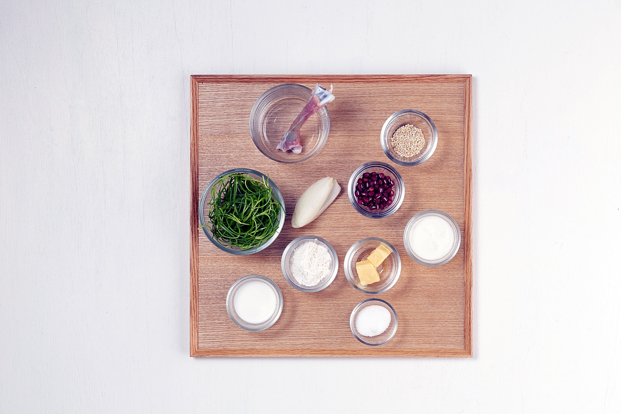 퀴노아 3g, 팥 10g, 무가당 휘핑크림 25g, 무염 버터 10g, 우유 15g, 닭뼈 20g, 밀가루 10g, 양파 10g, 세발나물 10g, 설탕 3g