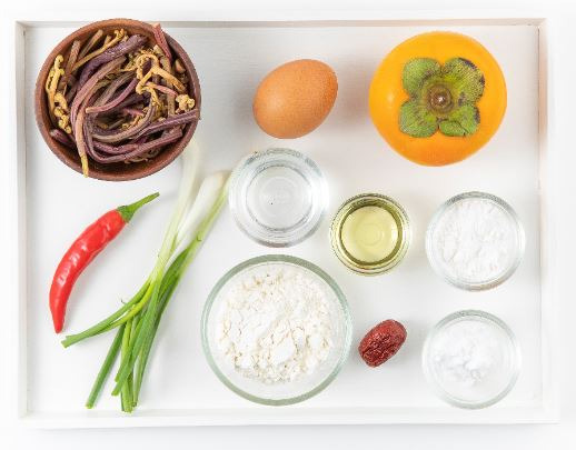고사리 30g, 쪽파 7g, 홍고추 6g, 계란 20g(0.3개), 밀가루 20g, 단감 13g, 물 30ml, 찹쌀가루 15g, 감자전분 50g, 대추 0.1g