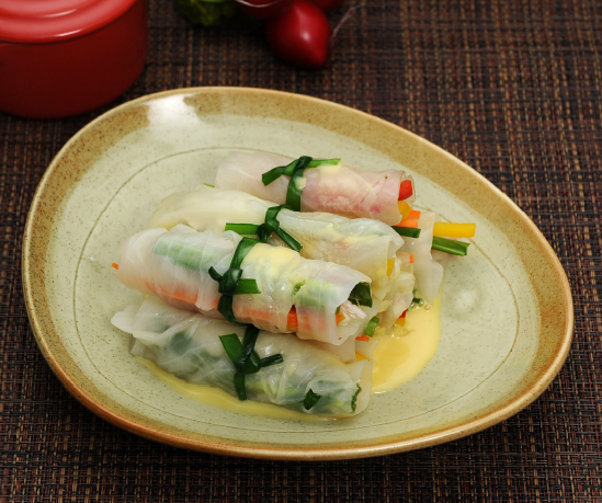 닭고기살(100g), 천일염(0.5g), 후춧가루(0.3g), 식용유(10g) 정종(10g), 양배추(80g), 부추(30g), 깻잎(10g) 홍파프리카(20g), 노랑파프리카(20g), 당근(20g), 양파(20g) - 소스 : 요거트(20g), 머스터드(20g), 꿀(10g), 레몬즙(10g) 설탕(5g)