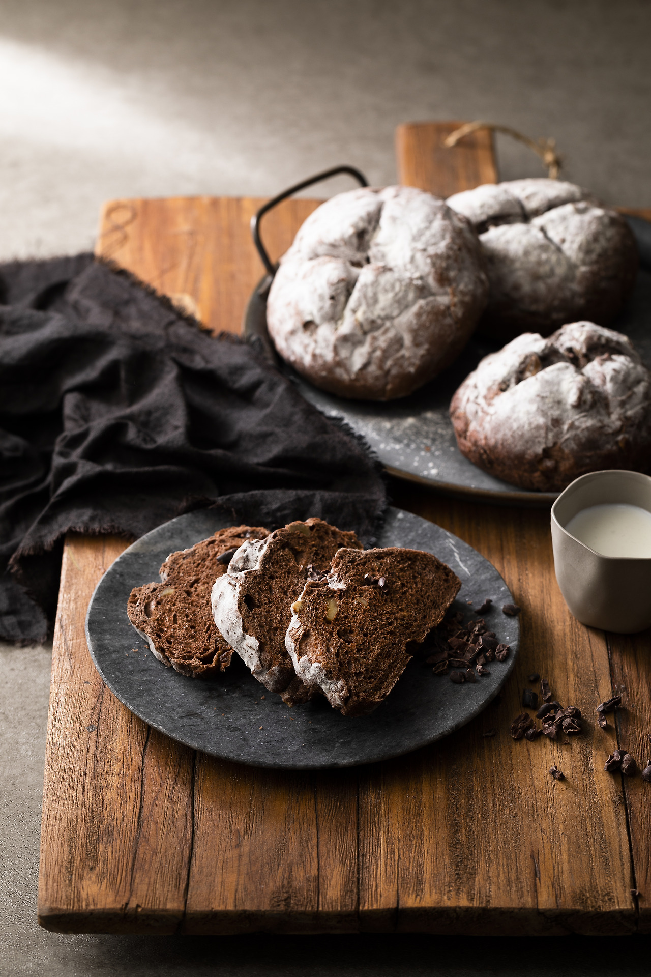 (반죽재료) 강력분 500g, 소금 8g, 코코아 30g, 버터 38g, 생이스트 8g, 드라이이스트(레드) 4g, 파트 페레멘테 95g, 우유 114ml, 물 236g (속재료) 카카오 닙스 94g, 호두 94g, 건포도 150g