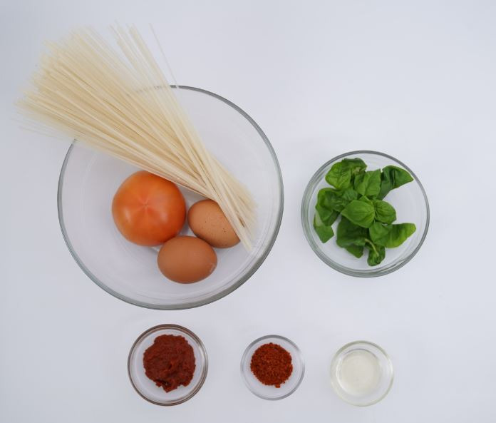 양파(20g), 바질(10g), 삶은 달걀(1개), 쌀국수(100g), 토마토(200g), 고추장(½Ts), 고춧가루(½Ts), 꿀(1Ts)