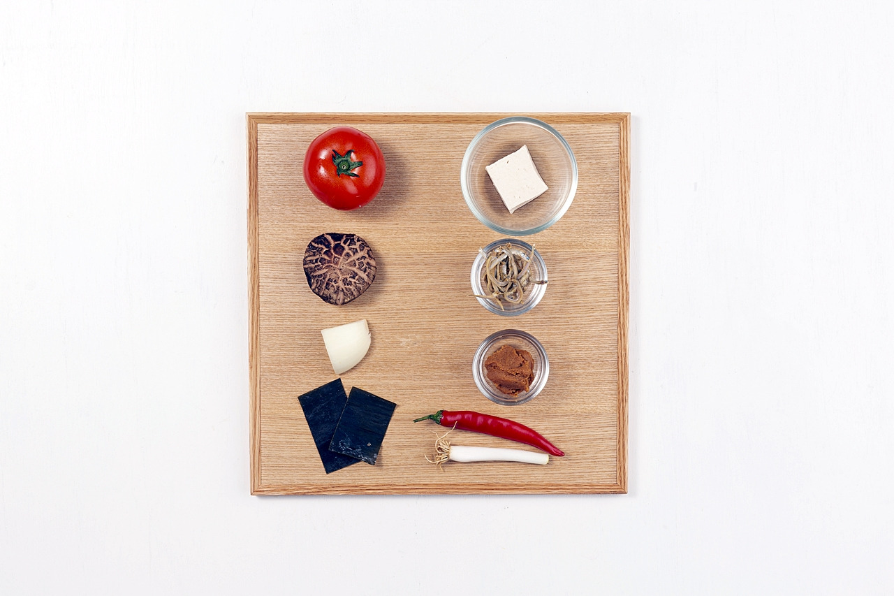 토마토 50g, 두부 30g, 양파 15g, 표고버섯 15g, 멸치 5g, 고추 8g, 대파 3g, 다시마 2g, 미소된장 30g