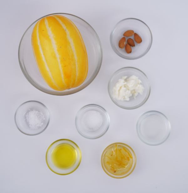 참외(110g), 아몬드(5g), 소금(1g), 설탕(2g), 레몬즙(15g), 올리브유(2g), 유자청(5g), 리코타치즈(15g)