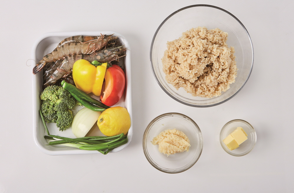[ 2인분 ] 브로콜리(¼개), 양파(¼개), 파프리카(빨강, 노랑 각 ¼개), 쪽파(2대), 블랙타이거새우(8마리), 현미밥(2공기), 청양고추(2개), 레몬(½개), 다진 마늘(3Ts), 버터(3Ts)