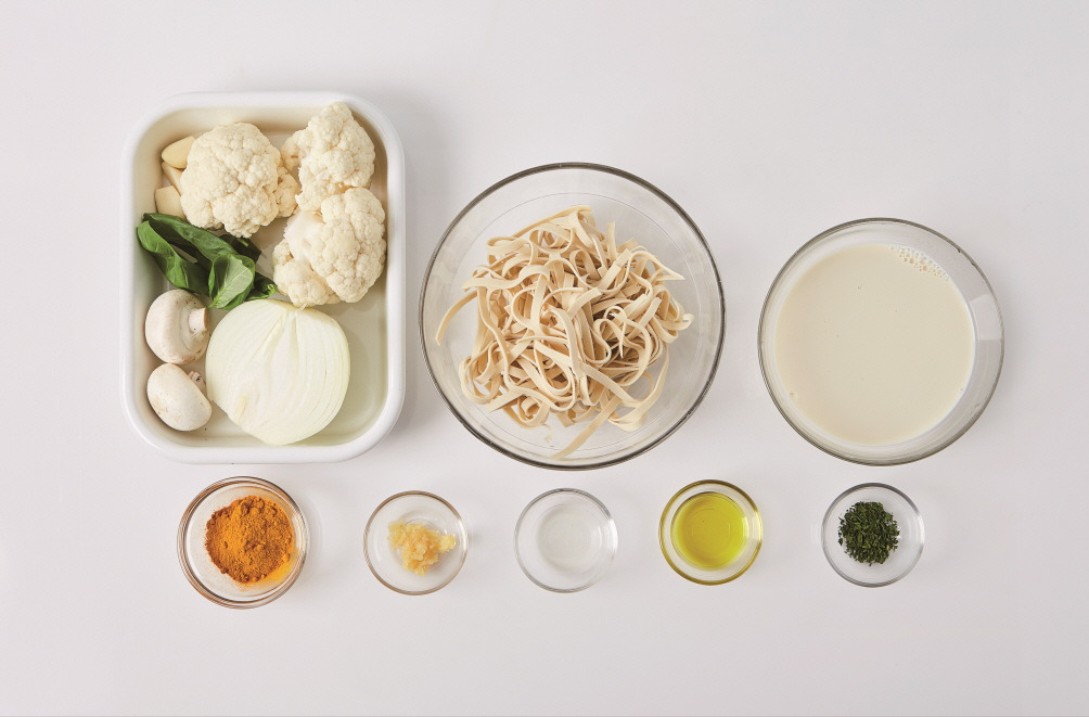 [ 2인분 ] 콜리플라워(200g), 양송이버섯(2개), 양파(½개), 마늘(3쪽), 무가당 두유(2컵), 두부면(1팩=100g), 바질(3장), 올리브유(1Ts), 다진 마늘(1ts), 강황가루(2Ts), 식초(1ts), 파슬리가루(1ts)