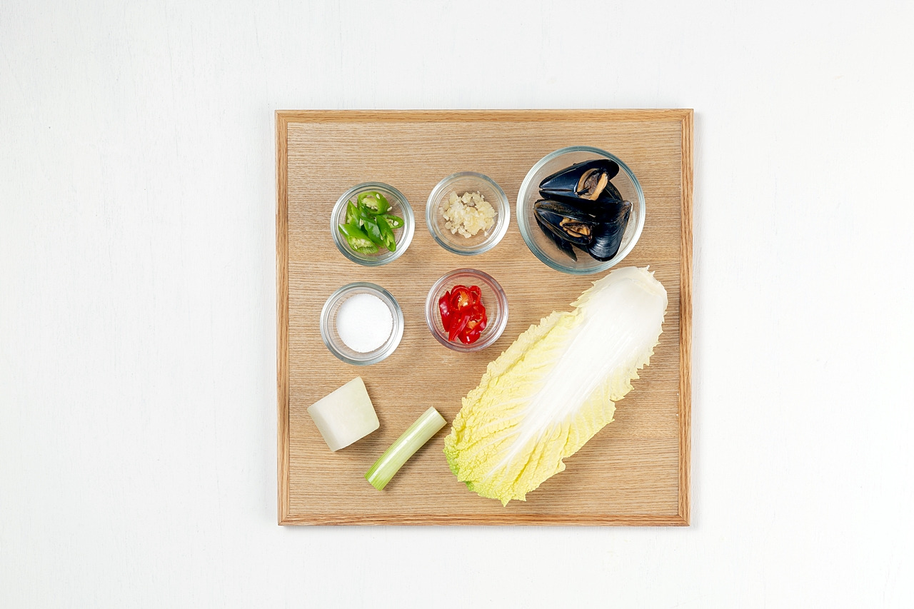 홍합 50g, 배추 50g, 무 30g, 마늘 2g, 파 3g, 홍고추 1g, 소금 0.3g