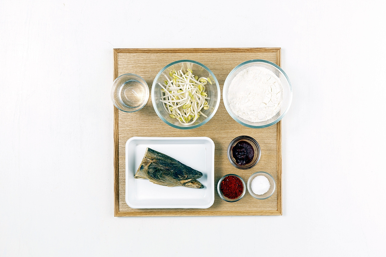 콩나물 50g, 황태머리 40g, 고추장 10g, 밀가루 100g, 고춧가루 5g, 소금 2g