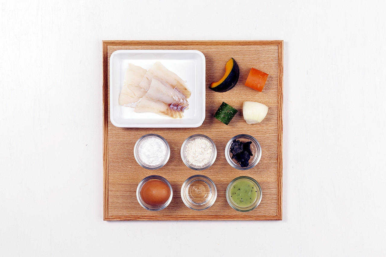 동태살 120g, 단호박 10g, 당근 15g, 오이 15g, 양파 15g, 전분 30g, 계란 110g, 튀김가루 10g, 목이버섯 3g, 식초 15g, 키위소스 20g
