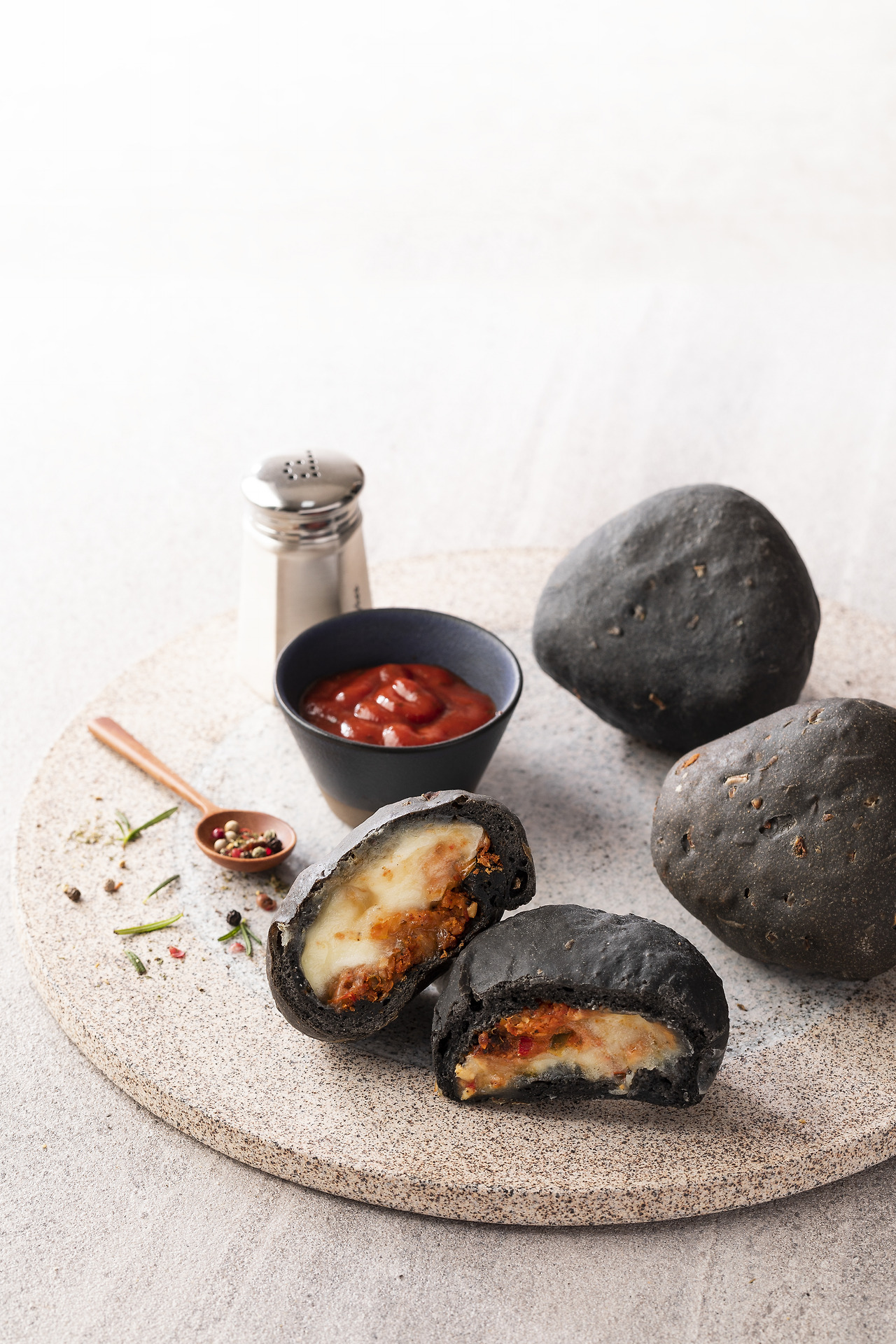 (반죽재료) 쌀가루 200g, 우유 80g, 물 15ml, 르뱅 발효종 160g, 달걀 50g(1개), 소금 3g, 올리브유 25g, 양파 30g, 당근 30g, 먹물 가루 30g (속재료) 토마토 250g, 양파 150g, 피망 60g, 마늘 20g, 닭가슴살 300g, 오레가노 5g, 바질가루 5g, 월계수잎 5g, 후추 5g, 소금5g, 고추5g, 고춧가루5g,모짜렐라 치즈 50g