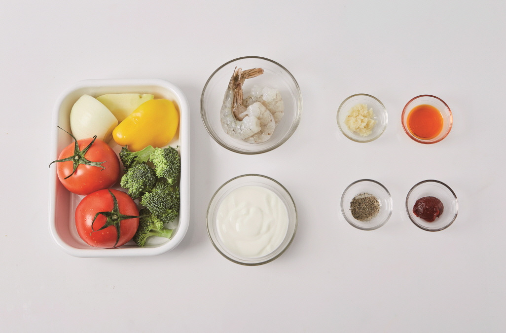 [ 2인분 ] 토마토(2개), 양파(¼개), 감자(¼개), 노랑 파프리카(¼개), 브로콜리(¼개), 새우(4마리) 고추기름(1Ts), 후춧가루(0.3Ts), 다진 마늘(0.3Ts), 플레인 요거트(½컵), 고추장(0.3Ts)