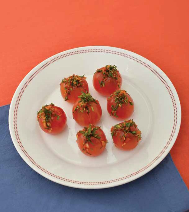 - 2. 깨끗이 씻은 방울토마토는 꼭지를 떼고 윗부분에 칼로 십자모양으로 칼집을 낸다.