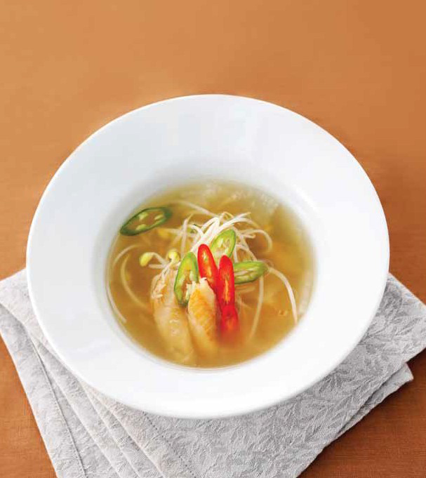황태해장국 황태(채) 15g(10개), 콩나물 30g(1/6봉지), 무 30g(5×3×2cm), 저염된장 10g(2작은술), 물 300ml(1½컵), 청양고추 5g(1/2개), 다진 마늘 2g(1/3작은술)