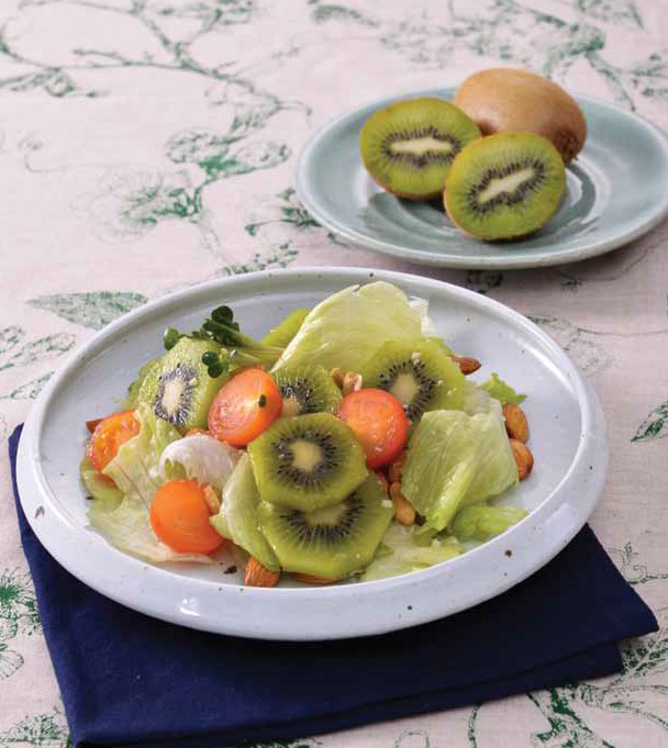 ●키위샐러드 : 키위 60g(1개), 방울토마토 100g(10개), 양상추 70g(2장), 아몬드 10g(6알), 땅콩 10g(10알), 무순 약간 ●마늘 드레싱 : 사과식초 30g(2큰술), 설탕 15g(1큰술), 물 50ml(1/4컵), 다진 마늘 5g(1작은술)