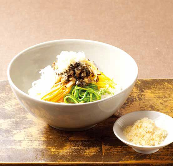 주재료 밥 210g(1컵), 북어 15g, 당근 15g(5cm), 애호박 15g(5cm), 달걀 100g(2개), 고사리 15g, 표고버섯 15g(2개), 우렁 25g(2큰술), 들기름 5g(1작은술) 장식 베이비채소 5g, 식용꽃 5g