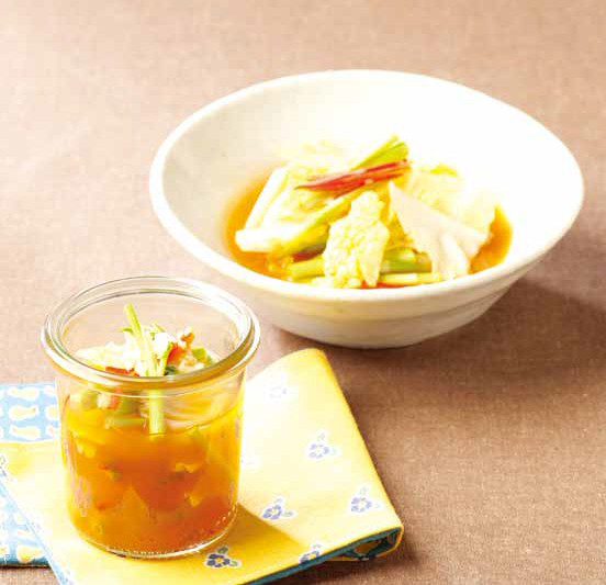 - 3. 귤즙에 고춧가루, 생강즙, 다진 마늘을 넣고 김치 국물을 만들고 배추, 미나리, 홍고추에 김치 국물을 부어 실온에 2일 숙성시킨다.본 저작물은 '식품의약품안전처'에서 작성하여 개방한 '조리식품의 레시피 DB'을 이용하였으며,