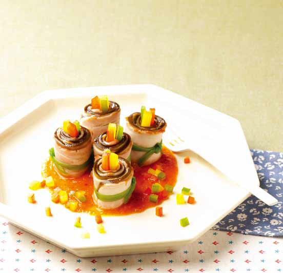 - 3. 가지는 찌고, 미나리와 베이컨은 데친 후 베이컨, 가지, 파프리카 순으로 올려 말아준 뒤 미나리로 묶어 접시에 담고 소스를 뿌려 완성한다.