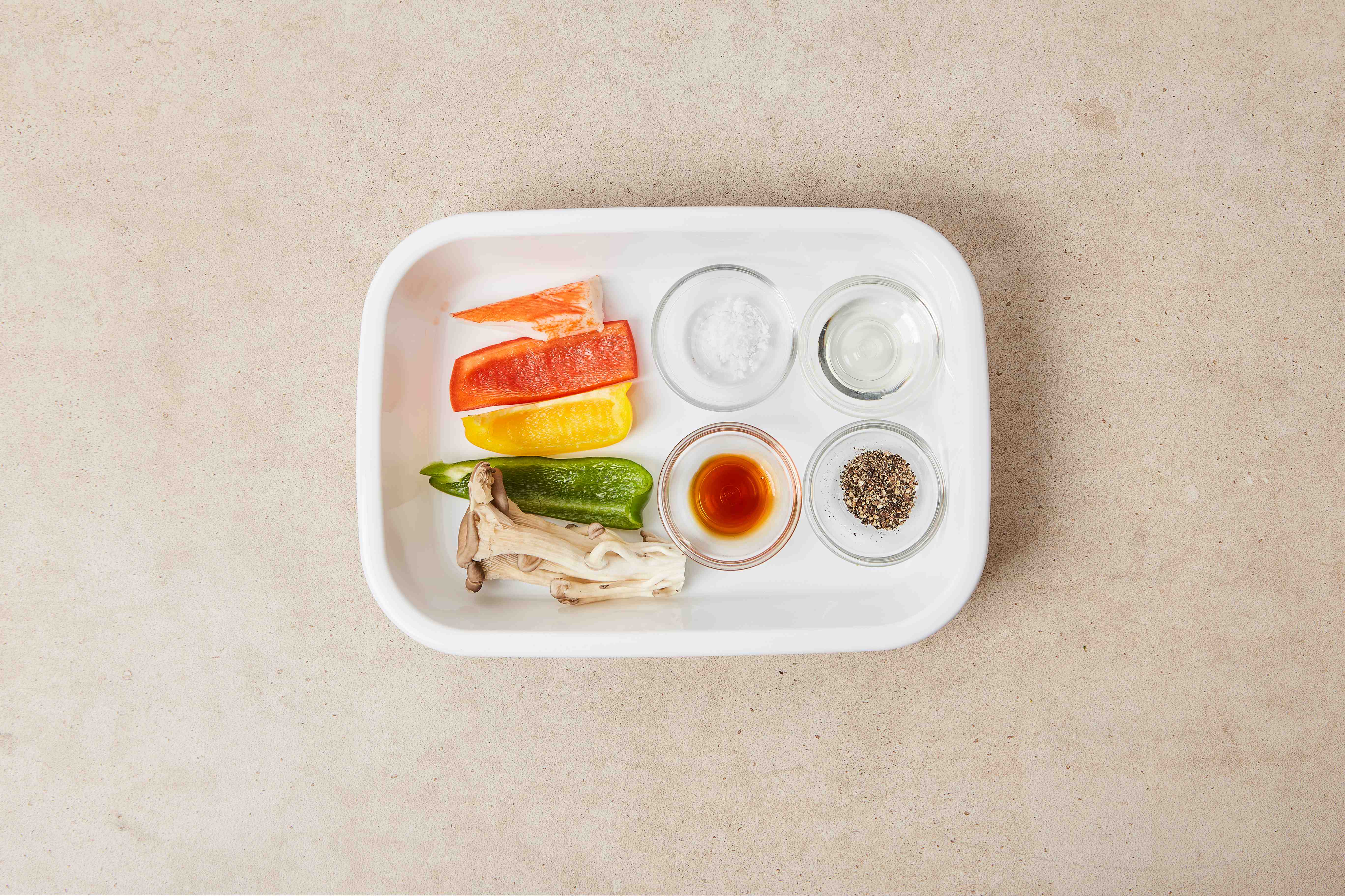 •필수재료 : 느타리버섯(25g), 파프리카(빨간색, 노란색 각 10g), 청피망(10g), 크래미(10g), 식용유(3g) •양념 : 소금(1g), 후추(3g), 간장(1g)