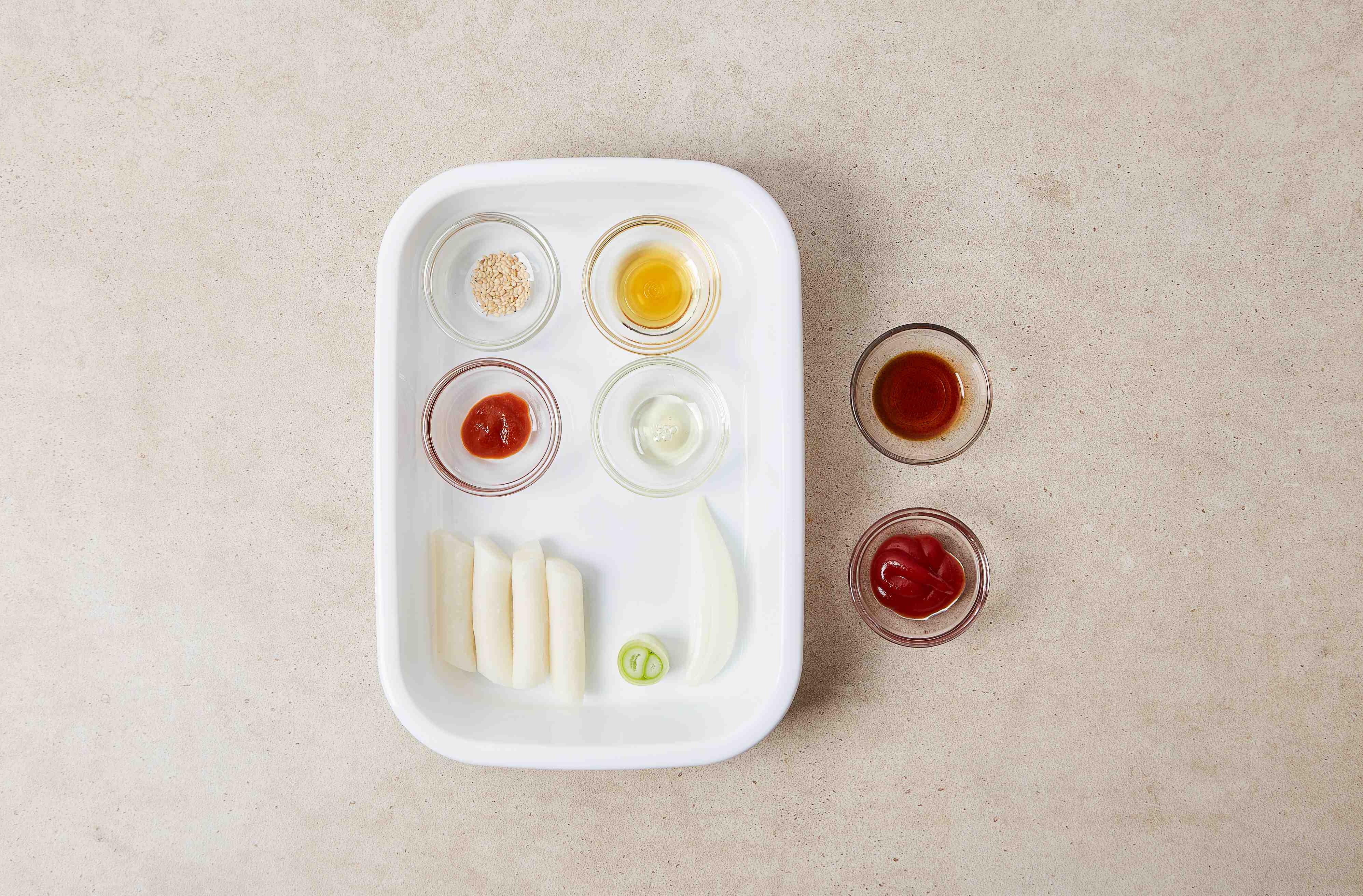 •필수 재료 : 떡볶이떡(40g), 파(3.5g), 양파(7g), 식용유(3g) •양념장 : 케첩(8g), 스리라차(3g), 올리고당(2g), 다진마늘(2g), 간장(1g), 참기름(1g), 통깨(0.5g)