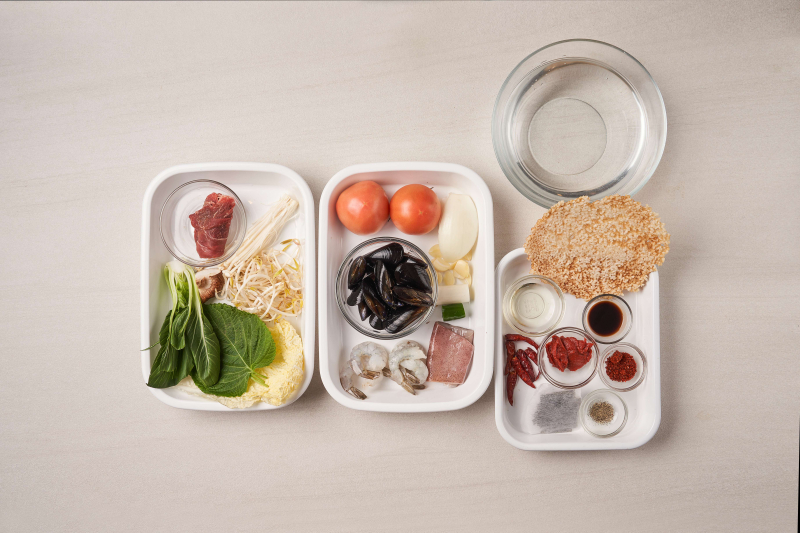 •[추가 재료] 오징어(30g), 새우(40g), 홍합(164g), 베트남 건고추(10g), 토마토(250g), 청양고추(4g), 양파(50g), 대파(흰 부분, 10g), 편 마늘(10g), 시판 누룽지(50g), 토마토 페이스트(20g), 식용유(10g), 간장(5g), 고춧가루(6g), 후추(3g), 다시팩(20g), 물(4컵=800g)