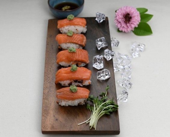 - 5. 와사비 가루에 30℃정도의 물을 넣고 섞은 뒤 발효 시키고, 초밥 형태를 만들어 그 위에 와사비를 바르고 연어를 올린 후 접시에 담는다