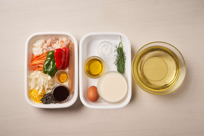 • [가정 간편식 재료] 새우(50g), 오징어(60g), 양장피 면(60g), 건목이버섯(10g), 참기름(4g), 양파(110g), 볶음 소스(20g), 크레미(40g), 당근(40g), 피망(45g), 붉은 파프리카(45g), 달걀지단(20g)