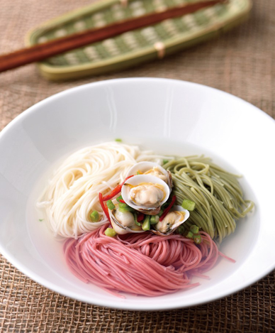 3가지색 소면(분홍, 초록, 흰색) 각 25g씩, 쪽파 20g, 청고추 20g, 홍고추 15g, 마늘 10g 국물 : 다시마물 400g, 모시조개 200g, 볶은소금 1g, 청주 15g
