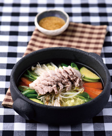 통삼겹 250g, 된장 10g, 통후추 2g 다진대파 5g, 팽이버섯 10g, 당근 20g, 배추 30g, 청경채 20g 애호박 25g, 숙주 25g, 청양고추 20g 육수 : 천연다시다 15g, 물 300g, 다진마늘 5g 곁들이장 : 어간장 15g, 겨자 5g, 식초 15g, 깨 5g