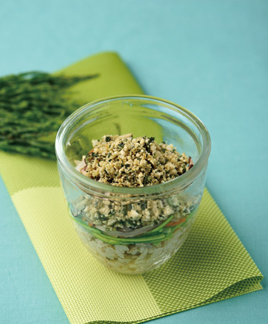 쌀 150g, 바지락 100g, 다진쇠고기 25g, 물 300g, 참기름 15g, 흰후추 1g, 다진마늘 15g 애호박 25g, 양파 25g, 오이 25g, 당근 25g, 표고 25g 두부볶음 : 두부 50g, 함초 25g, 깻잎 10g, 양파 20g, 다진파 15g, 다진마늘 15g