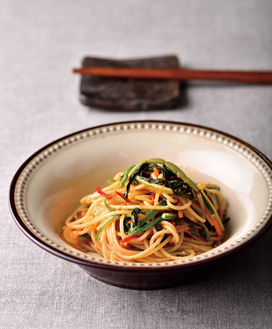 파스타면 50g, 열무김치 100g, 오이 20g, 청홍고추 각각 15g 노란 파프리카 30g, 양파 30g, 당근 25g 생들기름 30g, 통깨 2g, 청양고추 30g