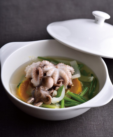 주꾸미 200g, 무 30g, 양파 50g, 대파 20g, 미나리 20g, 단호박 25g, 청고추 25g 국물 : 해물육수 400g, 청양고추 20g, 마늘 10g, 흰후추 1g