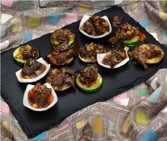 소등심(100g), 소금(0.3g), 후춧가루(0.03g), 로즈마리(0.5g) 애호박(20g), 양파(20g), 가지(20g), 파프리카(20g) 토마토(20g) - 소스 : 발사믹소스(20g), 설탕(10g), 마늘(20g), 사과(20g)