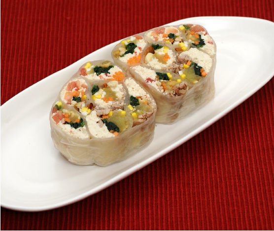 라이스페퍼(50g), 당근(20g), 달걀(30g), 시금치(20g) 소금(0.5g), 돼지고기(50g), 마늘(10g), 대파(10g), 맛술(10g) 저염간장(20g), 설탕(10g), 통깨(5g), 참기름(5g) 후춧가루(0.02g), 고구마(30g), 두부(20g), 토마토(20g) 양파(20g), 견과류(20g)