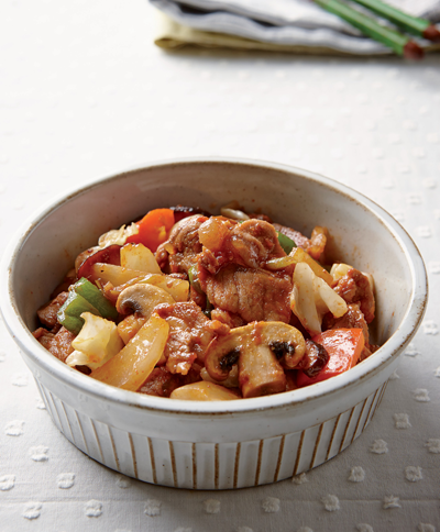 재료 양배추(40g), 양파(15g), 표고버섯(10g), 양송이버섯(30g) 파프리카(10g), 피망(10g), 대파(5g), 마늘(2g), 토마토(30g) 비트(0.5g), 식용유(5g), 돼지고기(100g) 양념 소금(0.5g), 설탕(1g), 후춧가루(0.2g), 간장(1g) 생강(0.1g), 고추장(5g), 물엿(3g)