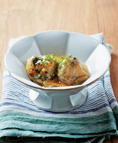 피시볼반죽 검은콩(15g), 쪽파(5g), 동태포(30g), 감자전분(10g) 밀가루(7g), 청양고추(1g), 달걀흰자(7g) 소스 마늘(5g), 녹말가루(2g), 가다랑어장국(3g), 간장(3g) 물(100ml), 유자청(3g), 대파(3g)