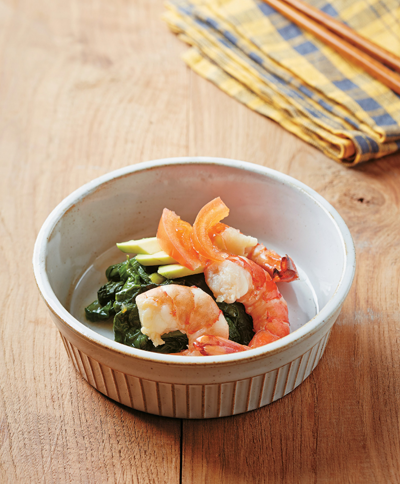 재료 대하(4마리), 화이트와인(15g), 시금치(50g), 유자청(40g) 매실액(10g), 아보카도(30g), 토마토(25g) 닭육수 닭다리(1개), 월계수잎(1g), 물(300g)