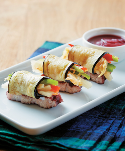 - 4. 김치, 피망을 가지에 넣고 돌돌 만다.