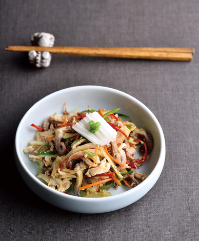 - 5. 미나리와 배를 곱게 채 썰어 올려서 완성한다.본 저작물은 '식품의약품안전처'에서 작성하여 개방한 '조리식품의 레시피 DB'을 이용하였으며,