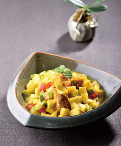 냉동고등어 300g, 전분가루 50g, 식용유 200g, 우유 200g, 카레가루 20g 감자 50g, 애호박 25g,, 방울토마토 25g, 양파 20g, 사과 25g, 꿀 15g