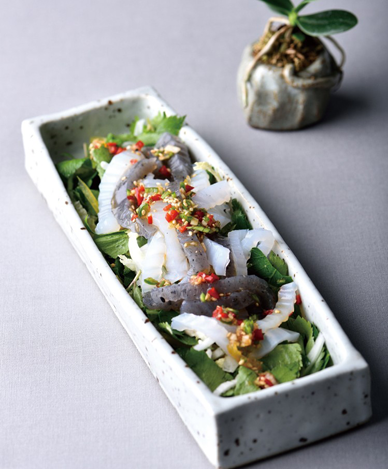 두가지 묵(올방개묵, 검정깨묵) 각 25g씩, 당귀잎 10g 양파 40g, 노란 파프리카 25g, 알배추 20g 소스 : 저염간장 15g, 유자청 30g, 다진청고추 7g, 다진홍고추 7g, 다진대파 7g