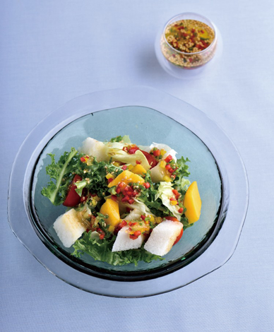 증편 200g, 망고 150g, 양상추 30g, 치커리 20g, 방울토마토 60g, 양파 60g 소스 : 올리브오일 30g, 유자청 15g, 식초 15g, 볶은소금 2g, 후추 1g, 다진 파프리카(노랑) 15g 다진 청피망 15g, 다진 홍피망 15g, 통깨 5g