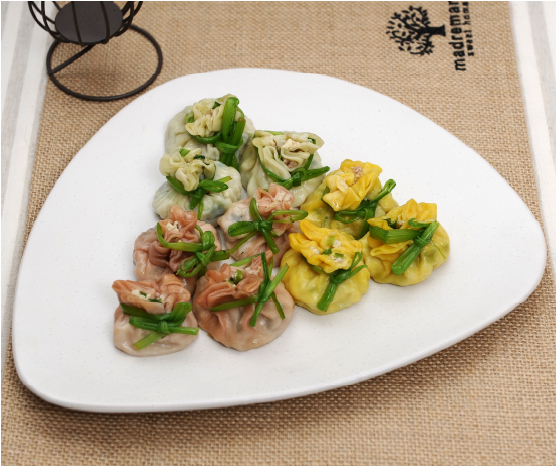 밀가루(200g), 백년초가루(20g), 뽕잎가루(20g) 치자가루(10g), 미나리(20g), 두부(30g), 오징어(30g) 다진 소고기(60g), 양파(20g), 부추(30g), 숙주(30g) 대파(10g), 마늘(10g), 참기름(10g), 후춧가루(0.05g) 통깨(5g)