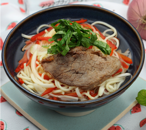 스파게티(100g), 올리브오일(10g), 소고기(50g) 저염간장(10g), 설탕(10g), 마늘(10g), 깻잎(10g) 양파(20g), 파프리카(20g), 육수(400g), 설탕(10g) 식초(10g), 저염간장(10g)
