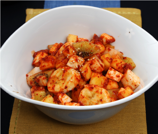 사과(50g), 배(30g), 설탕(10g), 바나나(50g), 키위(30g) 파인애플(30g), 마(50g) - 양념장 : 마늘(10g), 식용유(5g), 고춧가루(20g), 식초(10g) 저염간장(5g), 설탕(10g)
