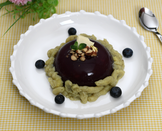 체리(50g), 고구마(150g), 화이트 초콜릿(50g), 판젤라틴(1장), 피스타치오(20g), 헤이즐넛(20g), 캐슈넛(20g), 호두(20g), 아몬드(20g), 라즈베리(20g), 건포도(20g), 애플민트(2g)