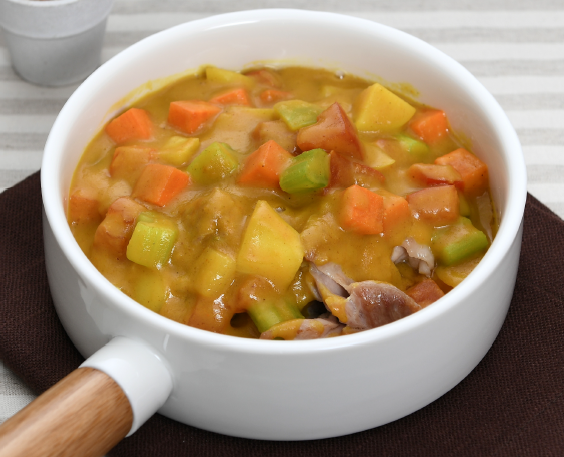닭고기(120g), 카레가루(20g), 당근(20g), 양파(20g), 샐러리(1/2개), 아스파라거스(3개), 토마토(50g), 감자(50g), 생크림(30g), 소금(0.1g), 후춧가루(0.01g)