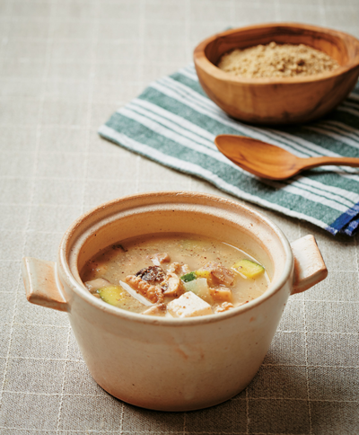 재료 느타리버섯(20g), 양송이버섯(20g), 표고버섯(20g), 두부(40g) 애호박(40g), 양파(30g), 밤(30g), 호두(10g), 멸치다시마육수(300g) 양념 들기름(10g), 들깻가루(30g)