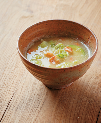 재료 마늘(0.3g), 양파(10g), 애호박(20g), 단배추(25g), 대파(5g) 두부(25g), 마른 새우(10g) 육수 무(15g), 멸치(2.5g), 다시마(2.5g), 물(300g) 양념 된장(10g), 표고버섯가루(3g), 날콩가루(10g)