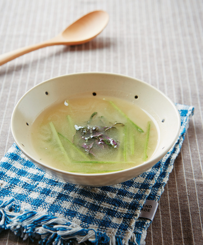재료 가다랑어포(5g), 오이(5g), 깻잎(1g) 육수 무(50g), 다시마(1g), 대파(10g), 물(500g) 된장양념 콩가루(1g), 설탕(1.5g), 식초(2g), 다진 대파(0.5g), 다진 마늘(0.5g) 다진 양파(0.5g), 다진 청양고추(1g), 저염된장(1g), 참기름(3g)