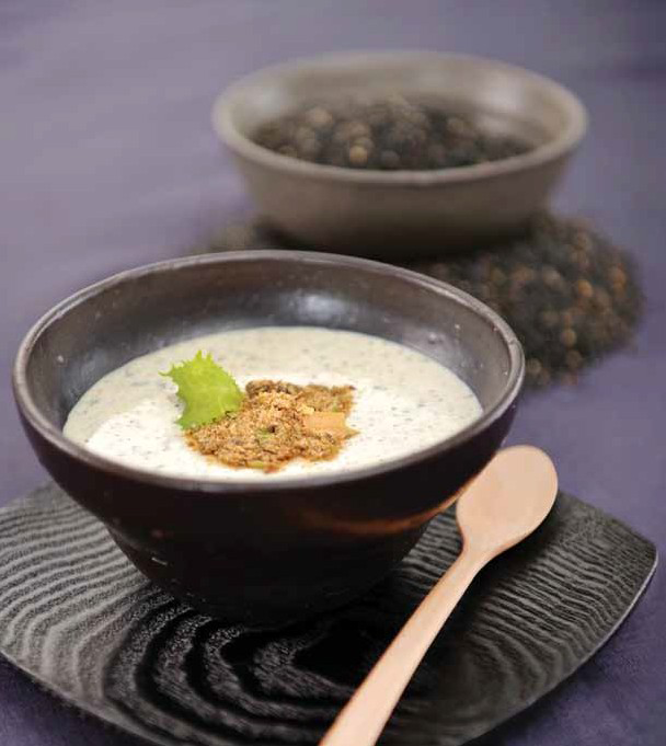 냉스프 두부 120g(1/3모), 플레인요거트 70g(1개), 검은깨 8g(1⅔작은술) 고명 청국장가루 10g(1큰술)